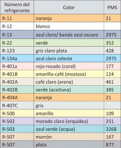 En cuanto a los colores del tanque de gas refrigerante, es necesario saber que los contenedores utilizados para su manejo, ya sean tambores, latas o cilindros retornables o desechables, se codifican con algún color. Para este fin, se estandarizó un código al que la mayoría de los fabricantes se apegan y cuyos lineamientos fueron establecidos por el Air Conditioning and Refrigeration Institute (ARI, por sus siglas en inglés). Esta institución usa, a su vez, un lenguaje internacional de colores de impresión, publicidad y empaque, denominado Pantone® Matching System (PMS), con el cual se establecen correlaciones ente números y colores.