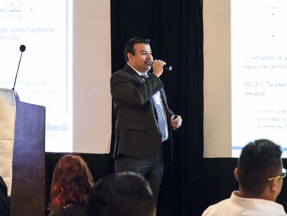 La ventilación por sistemas de extracción de aire, explicó el ponente, involucra tres tipos de flujo: el inducido, el del edificio –que varía y depende de las actividades de uso–, y el derivado, que es constante y complementa al anterior. El flujo total de todos éstos es el que se utiliza para calcular la velocidad y la potencia del ventilador de un sistema, así como la altura adecuada de su chimenea.
