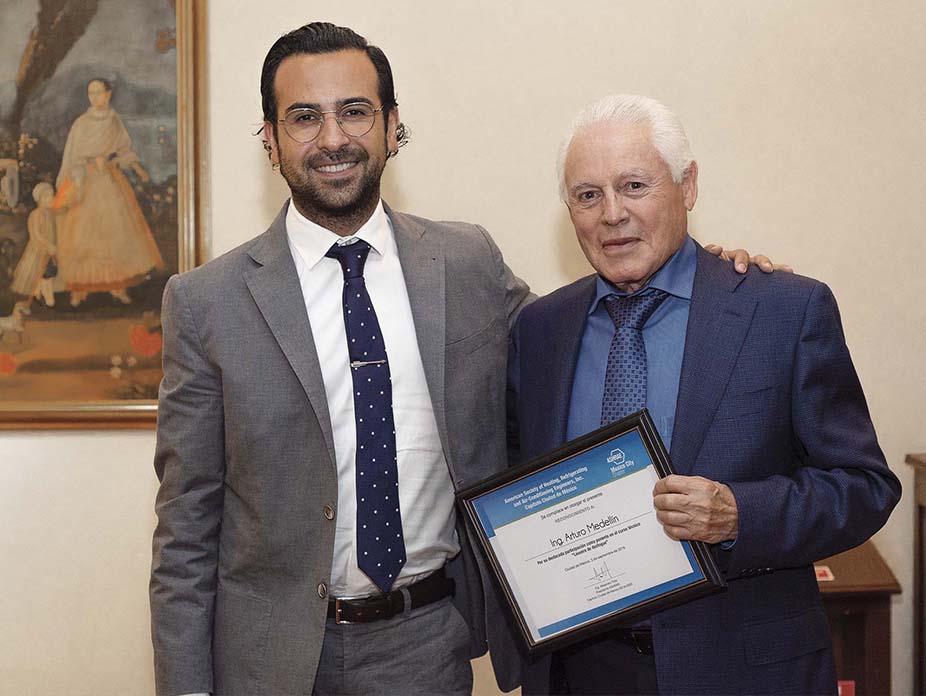 Fotografía superior. Alejandro Trillo, presidente de ASHRAE Ciudad de México, y Arturo Medellín, representante de Grupo NAMM